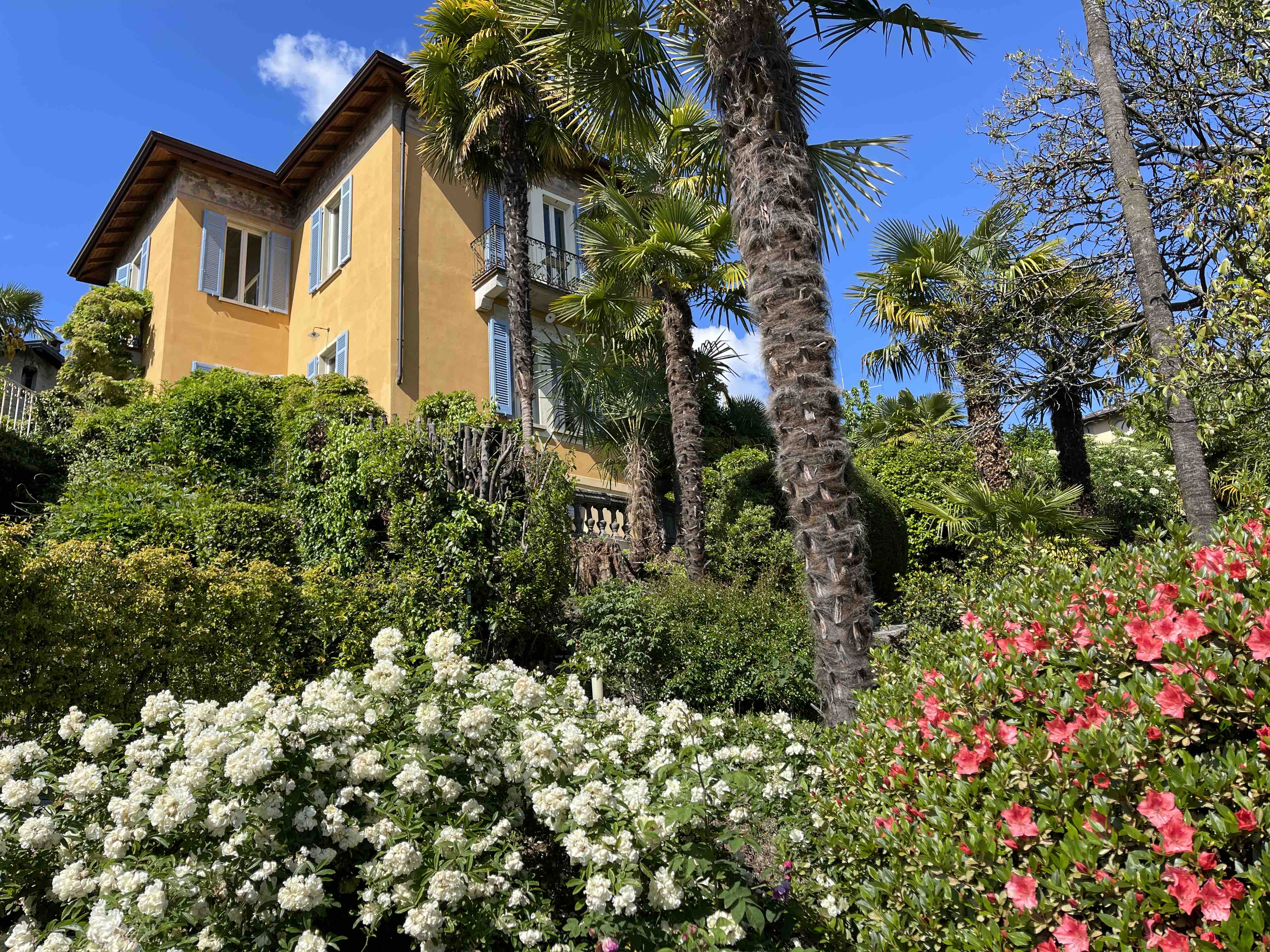 Schon beim Aufgang zu der erhöht liegenden Villa durch den historischen Garten mit alten Kamelienbäumen, Azaleen und Palmen eröffnet sich ein fantastisches Panorama über den Lago Maggiore. Im Innern strahlen die Wohnräume durch ihre hohen Decken mit beeindruckenden Malereien Großzügigkeit und Eleganz aus. Das Farbkonzept der Wände sorgt dabei für ein sanftes angenehmes Licht. Die originalen Fußböden sind größtenteils erhalten. So finden sich in der Hauptetage original Eiche-Fischgrät-Parkett und im Obergeschoss Pitch Pine Dielenboden. Im Parterre wurde der wunderschöne, handgearbeitete Cementine-Boden mit seinem antiken Muster wieder aufwendig zum Leben gebracht. Aus allen Räumen der Villa genießt man einen unvergesslichen Landschafts- und Seeblick bis hin zu den berühmten Borromäischen Inseln und dem schneebedeckten Gebirgsmassiv des Monte Rosa im Westen.